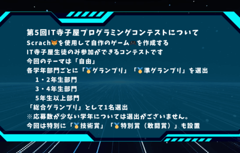コンテスト マイクラ・ROBLOXコンテスト(デジタネ) マイクラやROBLOXの作品は、毎年開催されるデジタネ主催に参加しよう!賞がたくさんあるので、始めたばかりでも入賞のチャンスがあります! 2025年プログラミングコンテストの概要はこちら その他の検定・イベント コンテスト IT寺子屋プログラミングコンテスト(Scratch)